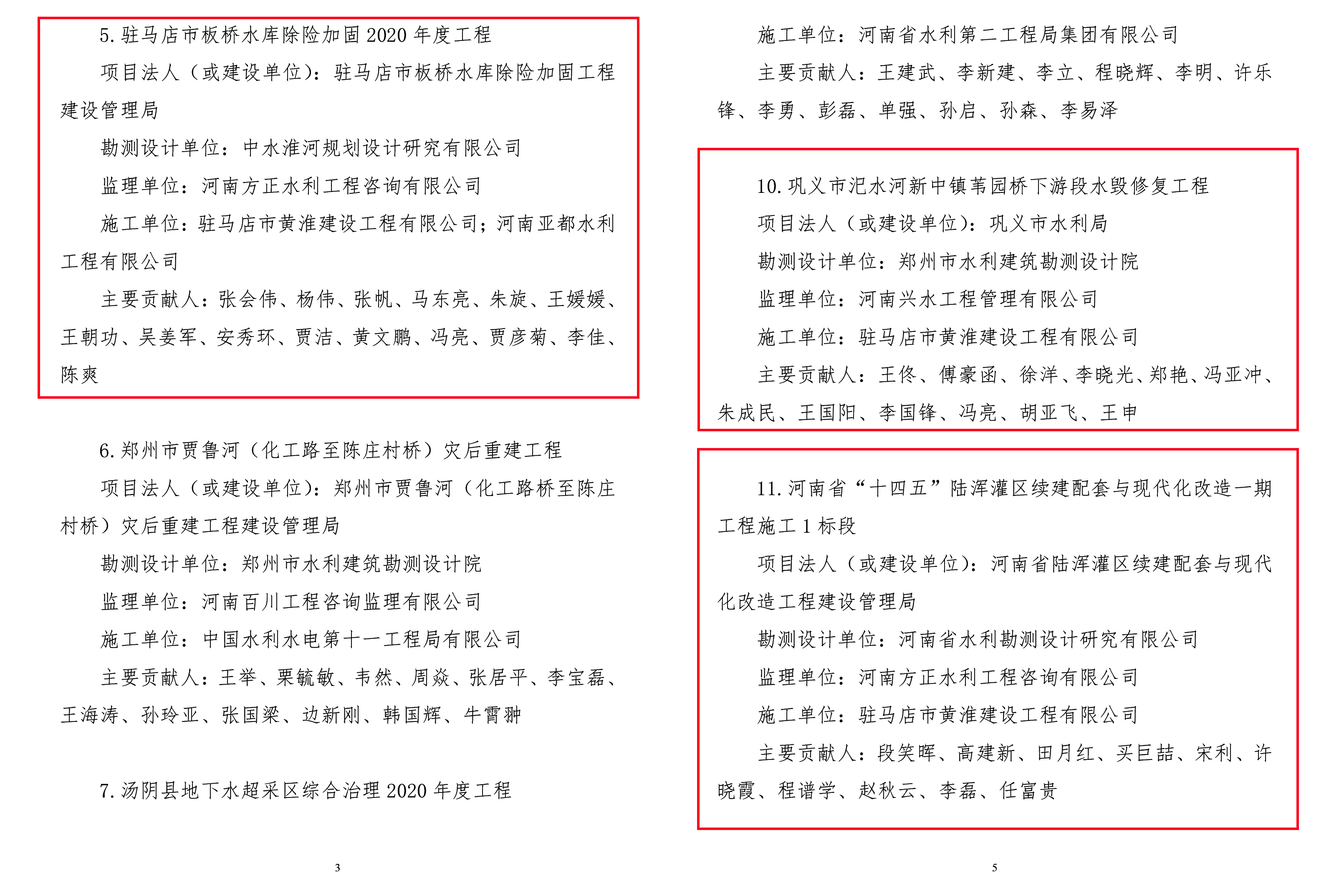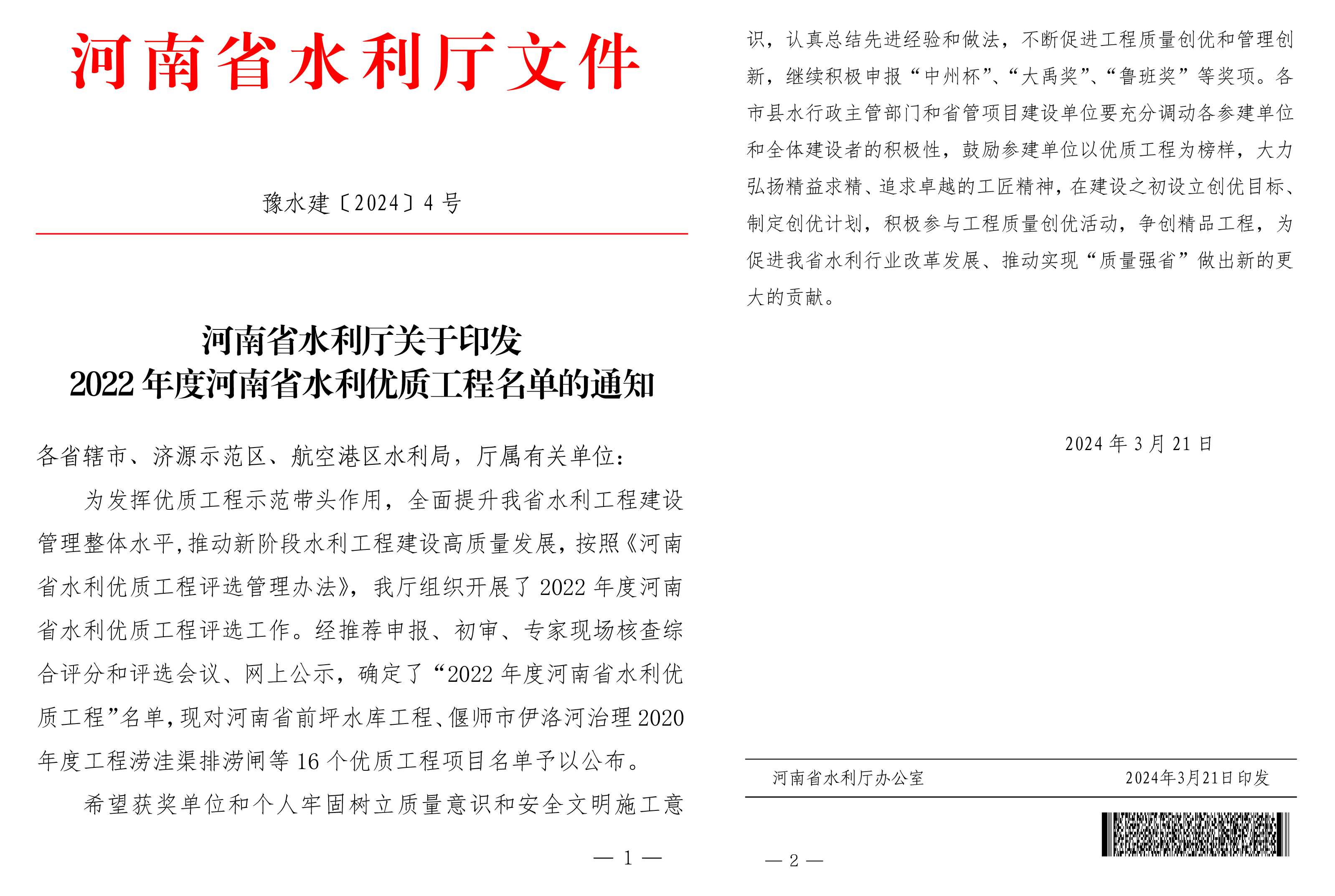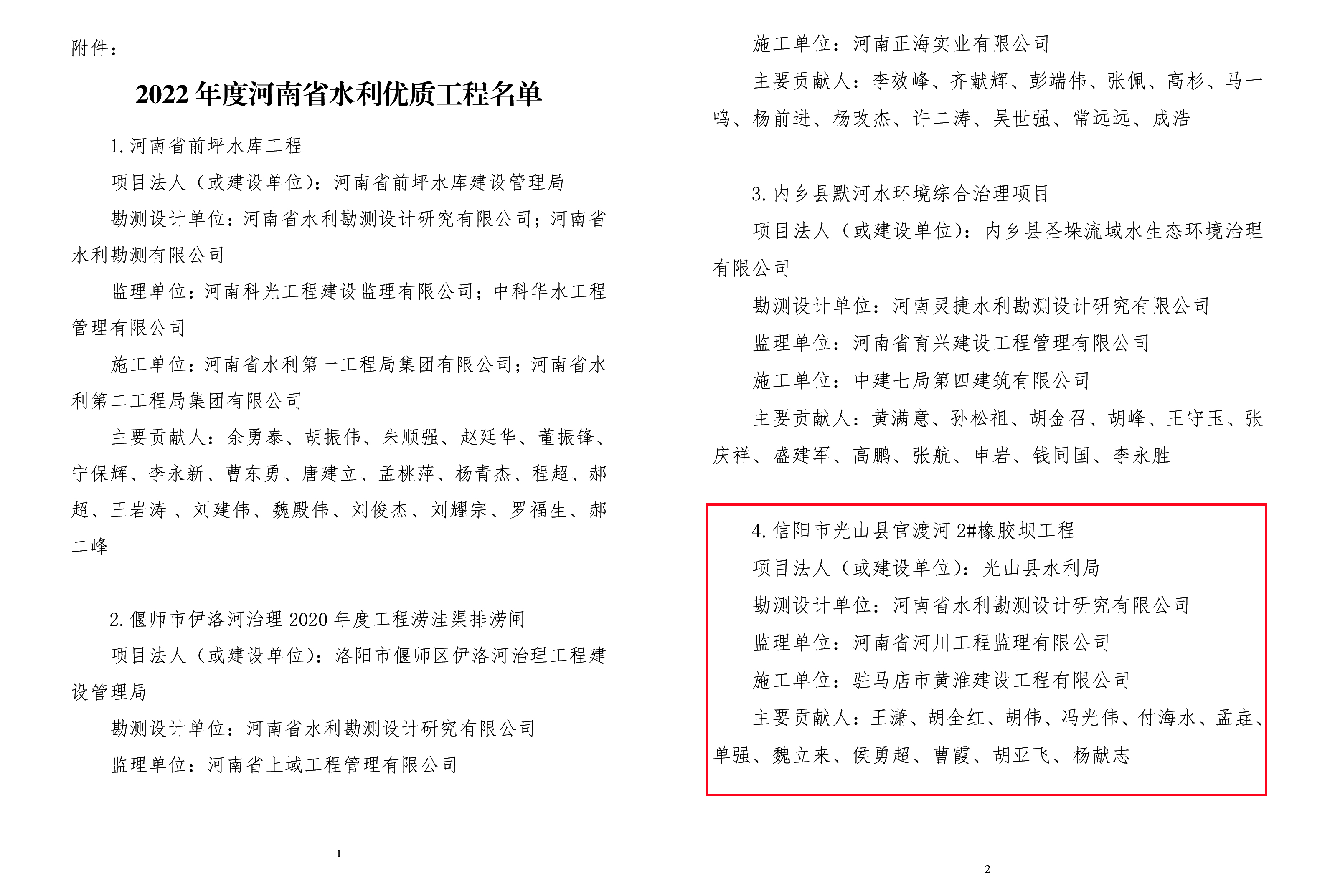 3月21日,河南省水利廳發(fā)布《2022年度河南省水利優(yōu)質(zhì)工程名單》,由我公司承建的駐馬店市板橋水庫(kù)除險(xiǎn)加固2020年度工程、信陽(yáng)市光山縣官渡河2#橡膠壩工程、河南省“十四五”陸渾灌區(qū)續(xù)建配套與現(xiàn)代化改造一期工程施工1標(biāo)段、鞏義市汜水河新中鎮(zhèn)葦園橋下游段水毀修復(fù)工程等4個(gè)項(xiàng)目憑借卓越的項(xiàng)目管理和工程技術(shù)實(shí)力,榮獲“2022年度河南省水利優(yōu)質(zhì)工程獎(jiǎng)”稱號(hào)。