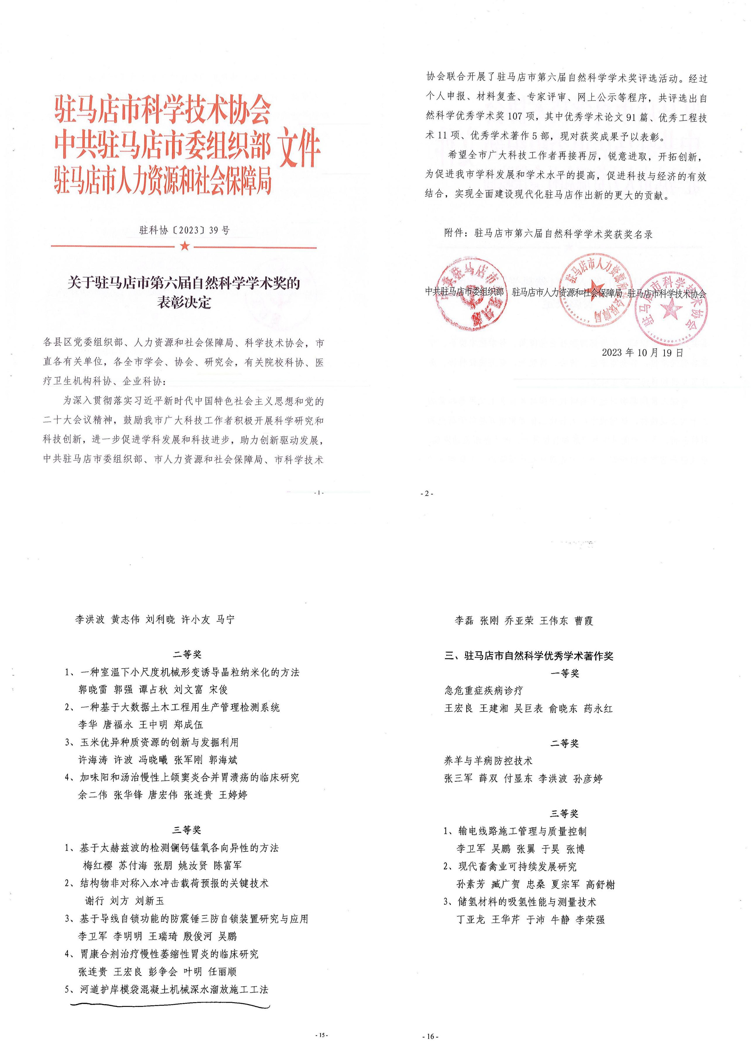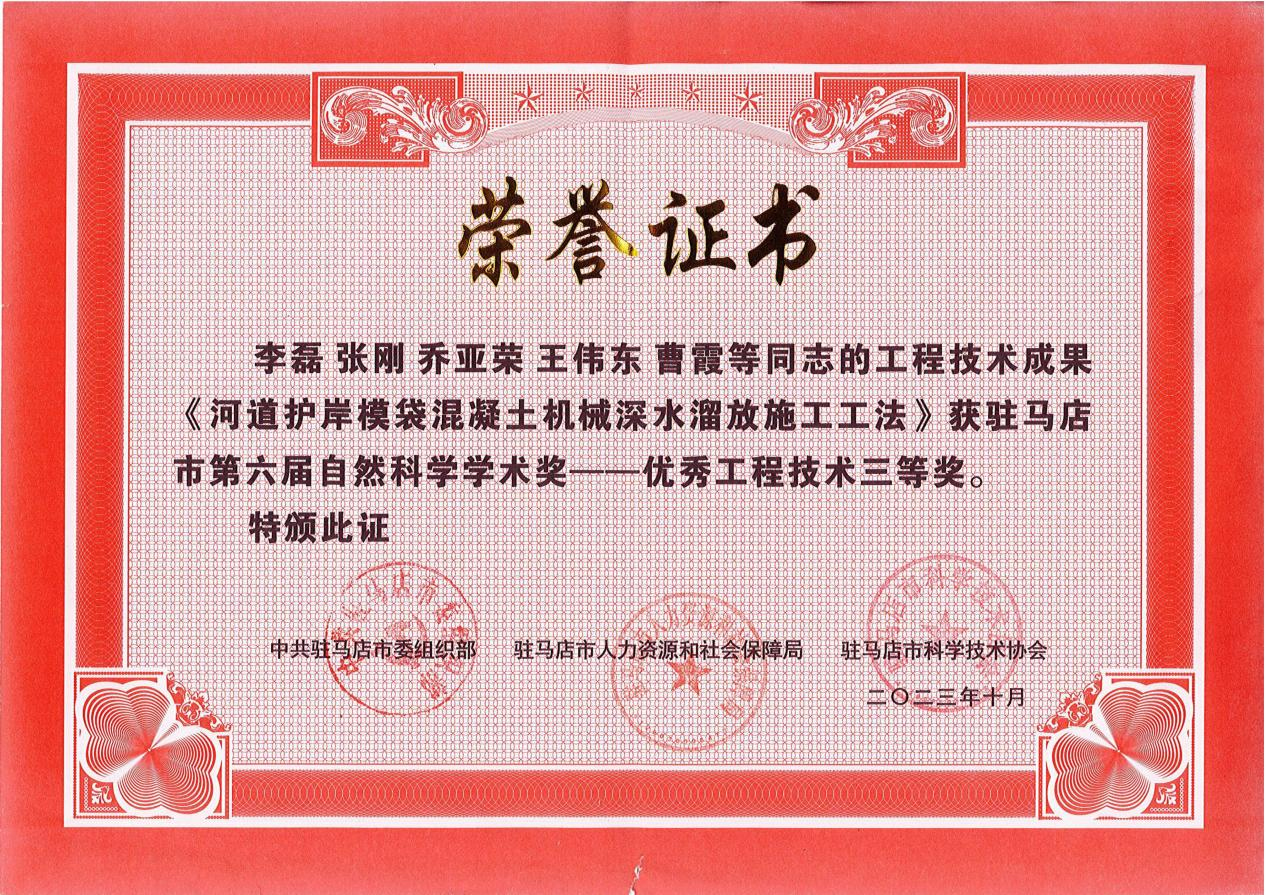2023年10月19日,駐馬店市科學(xué)技術(shù)協(xié)會(huì)、中共駐馬店市委組織部、駐馬店市人力資源和社會(huì)保障局聯(lián)合發(fā)布了《駐馬店市第六屆自然科學(xué)學(xué)術(shù)獎(jiǎng)獲獎(jiǎng)名錄》,駐馬店市黃淮建設(shè)工程有限公司李磊、張剛、喬亞榮、王偉東、曹霞等同志的工程技術(shù)成果《河道護(hù)岸模袋混凝土機(jī)械深水溜放施工工法》獲駐馬店市第六屆自然科學(xué)學(xué)術(shù)獎(jiǎng)——優(yōu)秀工程技術(shù)三等獎(jiǎng)。