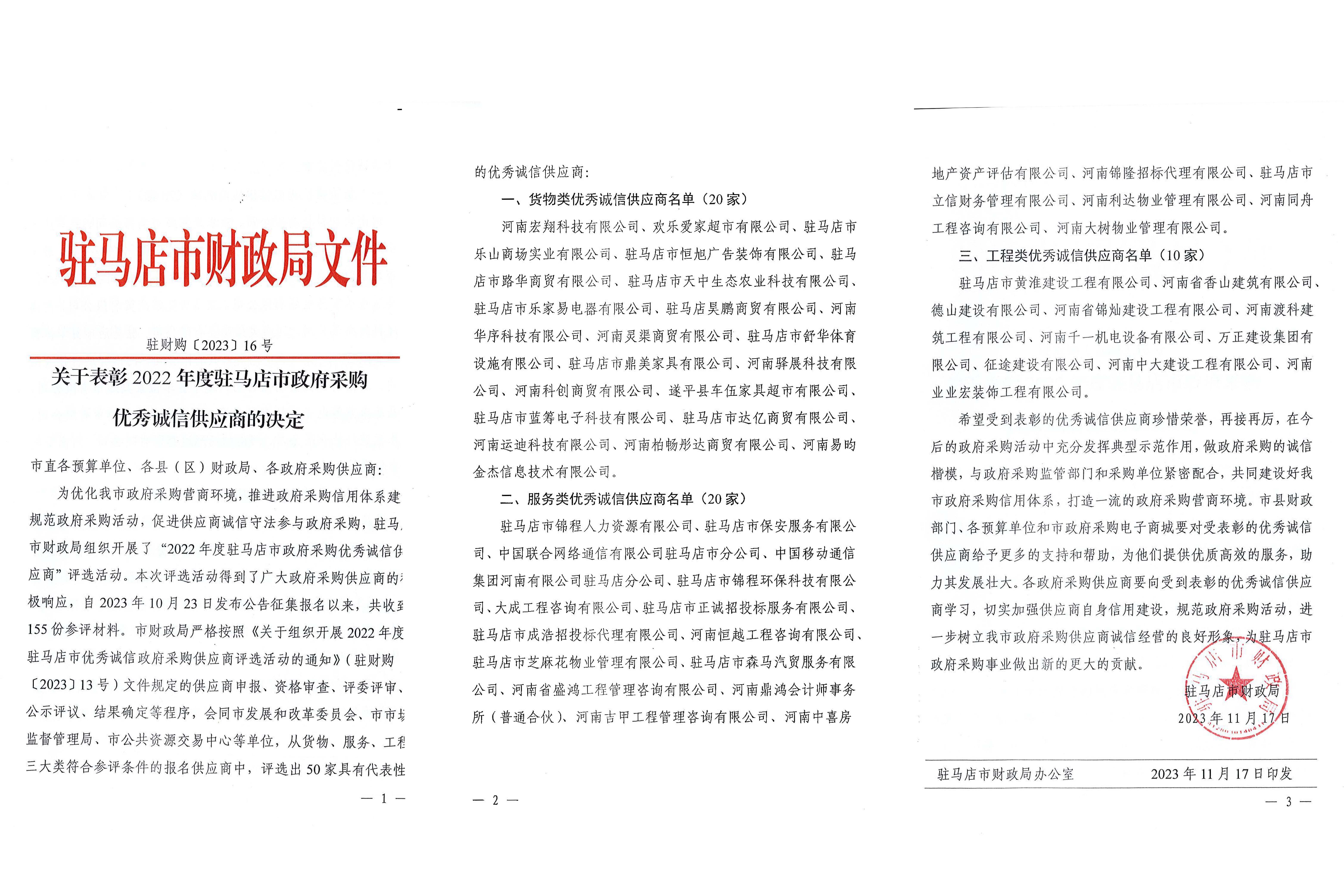 2023年11月21日,駐馬店市財(cái)政局召開全市政府采購(gòu)優(yōu)秀誠(chéng)信供應(yīng)商表彰暨優(yōu)化政府采購(gòu)營(yíng)商環(huán)境會(huì),市產(chǎn)業(yè)集團(tuán)子公司黃淮建工被評(píng)為“2022年度(第三屆)駐馬店市政府采購(gòu)優(yōu)秀誠(chéng)信供應(yīng)商”。成為評(píng)選出的10家“2022年度工程類優(yōu)秀誠(chéng)信供應(yīng)商”之一。